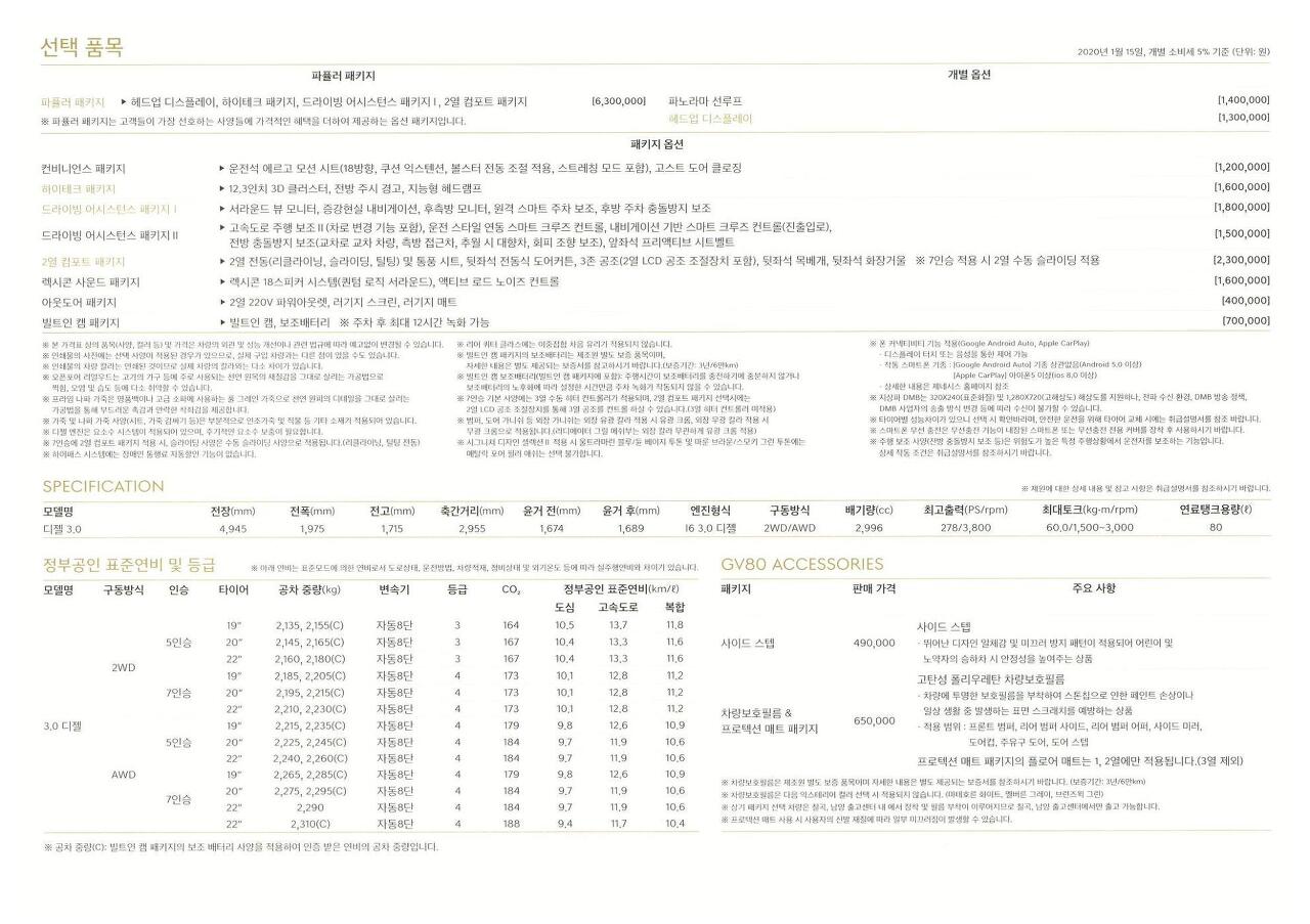 제네시스 GV80 디젤 모델은 최고출력 278마력, 최대토그 60.0kg.m이며, 후륜구동 5인승 차량 기준의 복합 공인연비는 11.8km 입니다. 제네시스 GV80의 주요 사양에도 나와있고, 외장 색상은 카디프 그린, 우유니 화이트, 비크 블랙, 세빌 실버, 로얄 블루, 카본 메탈, 리마 레드, 골드코스트 실버 등의 유광 컬러와 마테호른 화이트, 멜버른 그레이, 브런즈윅 그린으로 적용됩니다.
