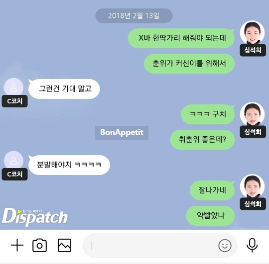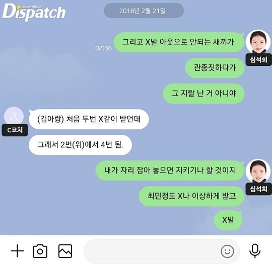 '디스패치'가 터뜨렸습니다. 심석희 선수가 과거 평창동계올림픽 여자 쇼트트랙 500m 조별예선에 있었던 대화 내용을 보도했는데요. 심석희와 c코치는 최민정이 속해있는 경기를 지켜보면서 중국 선수인 취춘위를 응원했다고 하는 내용의 보도인데요. 지금 그 카톡 대화 내용이 어마어마하여 논란이 일파만파 커지고 있습니다. 심지어 C코치와 심석희와의 관계도 아주 부적절한 관계라고 하는데요. 어떤 내용인지 알아보겠습니다.