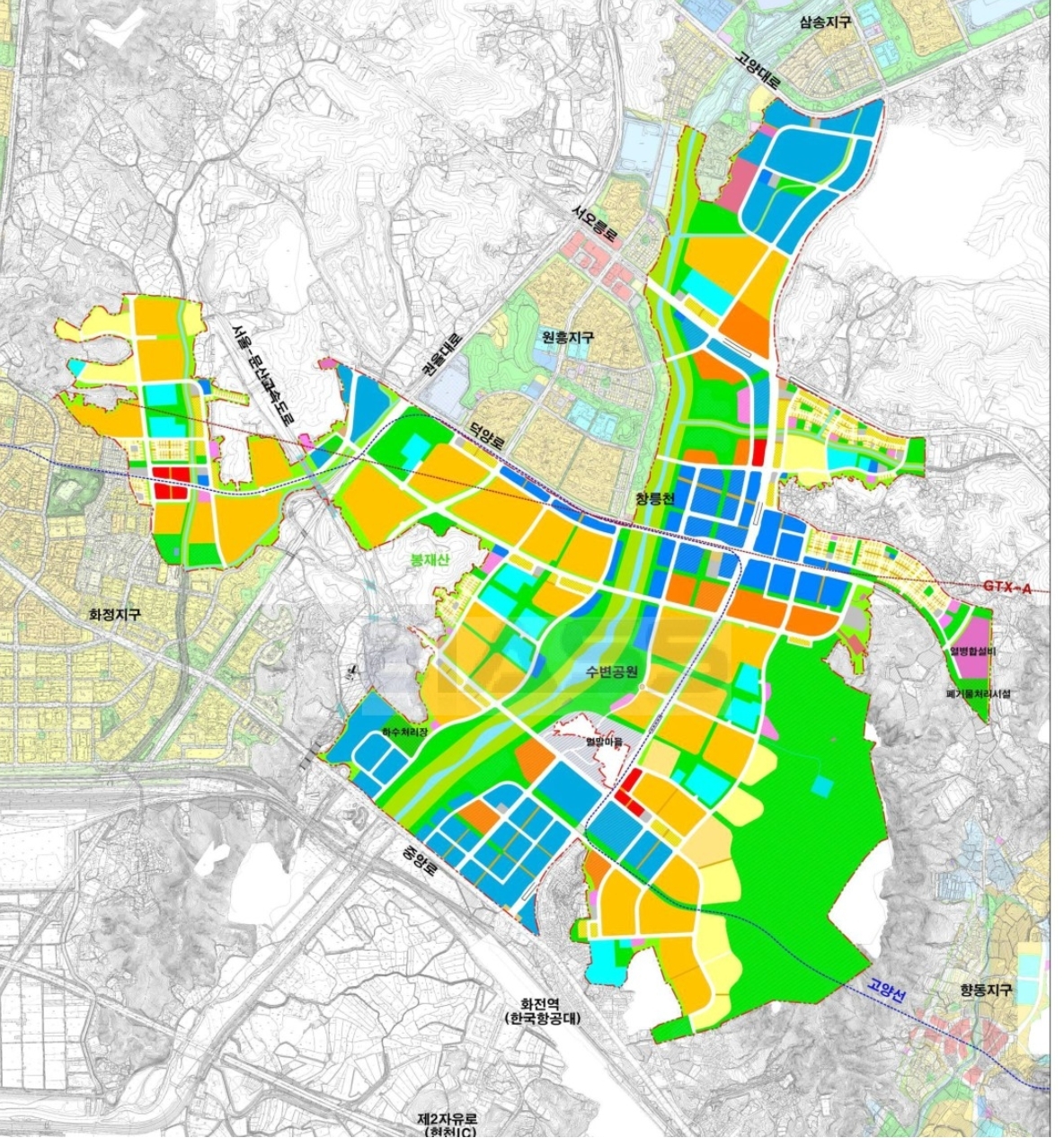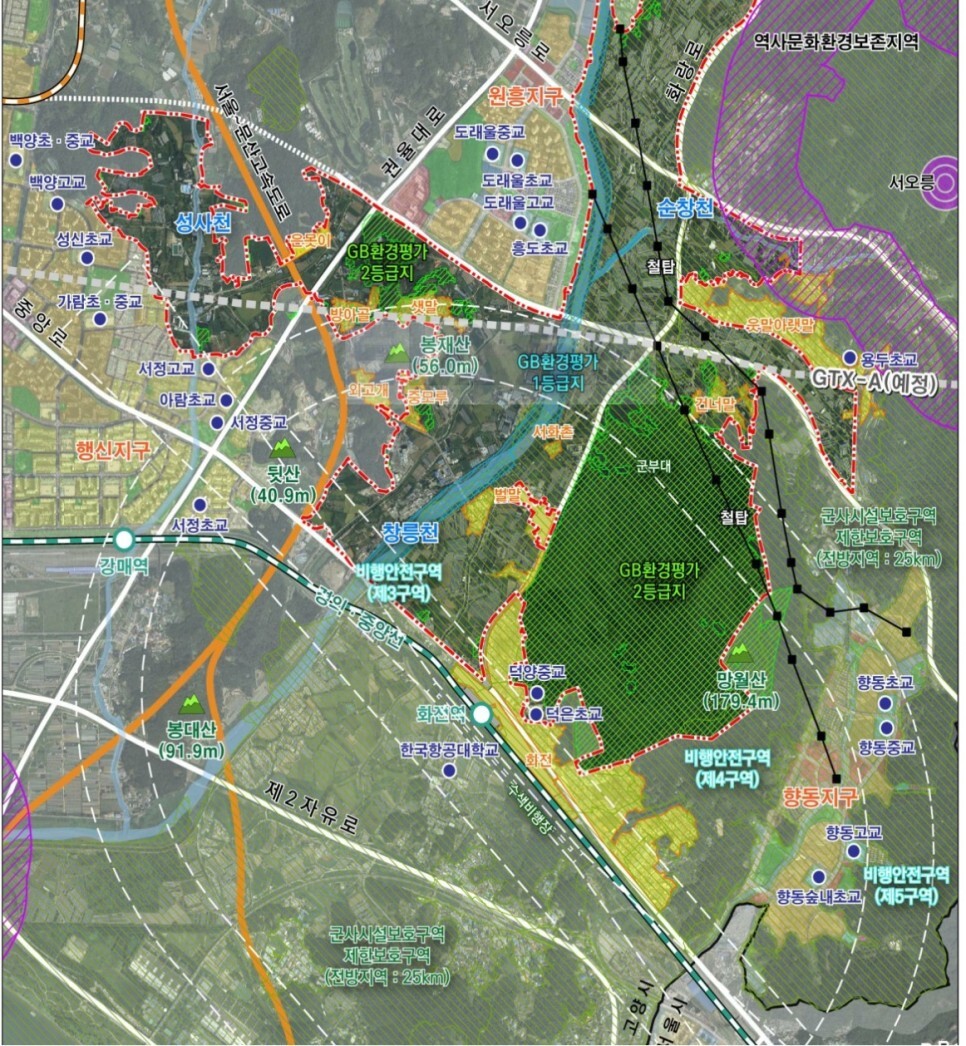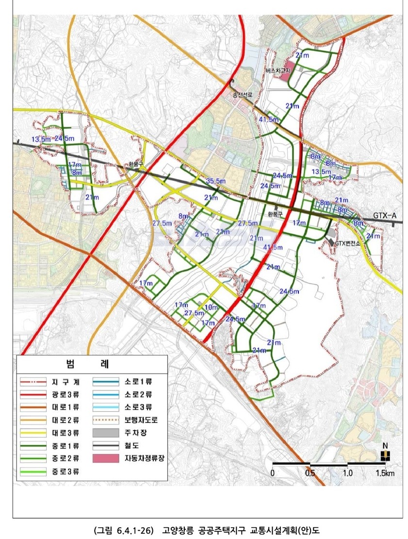 반대로 고양선(고양시철-새절역)은 중심지역을 관통할 확률이 매우 큽니다. GTX-A 창릉역의 이용인원 등을 감안하여 볼 때, 보다 넓고 주차장 부지가 확보될만한 위치가 열병합설비, 폐기물처리시설과 조금 더 가까워질 수 있다는 얘기가 될 수 있습니다.