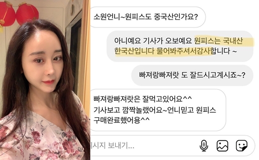 함소원은 누리꾼과 나눈 DM도 캡처해 공개하며 "원피스도 중국산이냐"는 물음에 "아니다. 오보다. 원피스는 국내산 한국산이다. 물어봐주셔서 감사하다"고 답했습니다. "문제 있으면 환불되는 건 맞냐"는 질문에는 "당연하다. 제품에 하자가 있으면 교환·환불 된다"고 말했습니다.