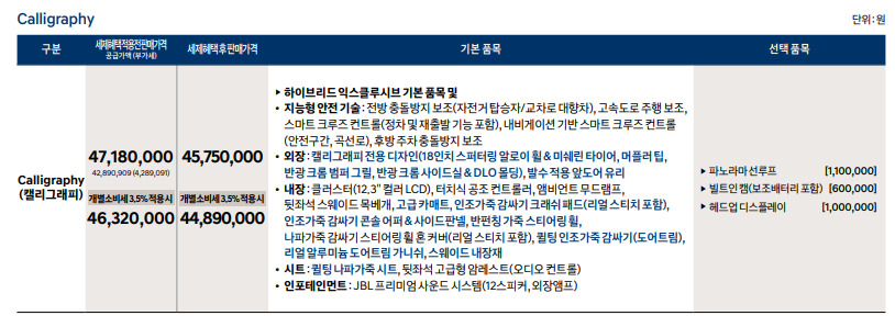 르블랑 3,900만원, 익스클루시브 4,012만원, 캘리그래피 4,489만원으로 책정되었습니다.