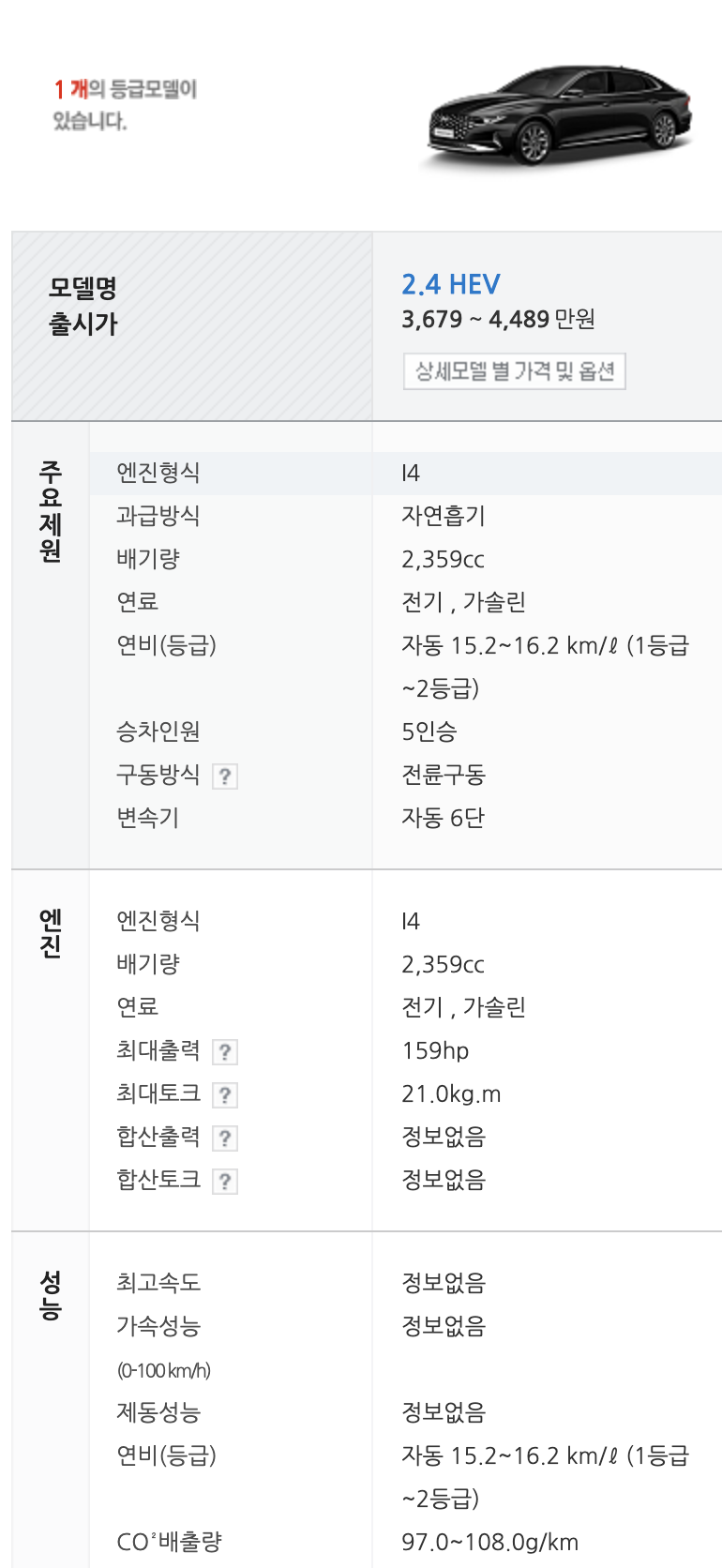 2021 그랜저 하이브리드 제원과 연비, 타이어 규격