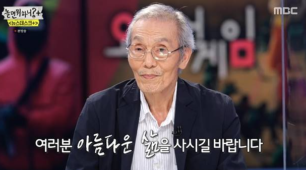16일 오후 6시25분에 방송된 MBC 예능 '놀면 뭐하니?+'에서는 신입 기자 유재석, 정준하, 하하, 신봉선, 미주가 만드는 '뉴스데스크+'가 공개됐습니다. 이날 넷플릭스 오리지널 '오징어 게임'으로 큰 사랑을 받고 있는'오징어 게임'의 001번 참가자 '오일남' 역을 맡은 배우 오영수가 '놀면 뭐하니?+'의 '뉴스데스크+' 초대석에 등장했습니다.
