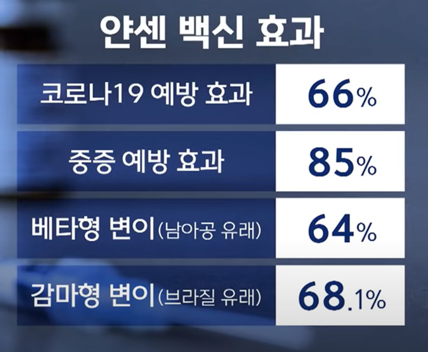 화이자백신은 우리 몸에 항체를 그냥 넣어주는 방식이고, 얀센과 아스트라제네카는 감기 바이러스를 주입해서 우리 몸에서 바이러스에 대한 항체를 만들어내는 방식입니다. 얀센 백신이 1회 접종만 하는 것은 면역 증강 요법을 조금 다르게 해서 1회 접종만으로도 66%의 예방력을 가지고 있는 것입니다. 아스트로 제네카가 70%로 4% 차이가 나지만, 1회 접종만으로 66%의 예방력을 갖춘다는 것도 상당히 긍정적인 효과입니다.
