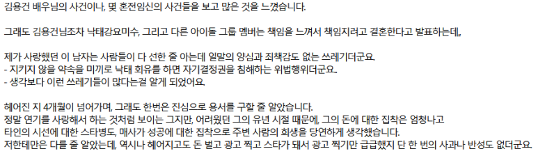 자신을 K배우의 전 여자친구라고 밝힌 작성자는 "2020년 초부터 만나 헤어진 지 4개월이 지났다"며 "그의 인성만 쓰레기라면 이런 폭로도 하지 않을 거다. TV에선 너무 다르게 나오는 그 이미지에 제가 정신적으로 일상생활을 할 수가 없기에 모든 리스크를 감수하고 이렇게 글을 올리기로 마음을 먹었다"라며 심경을 전했습니다.