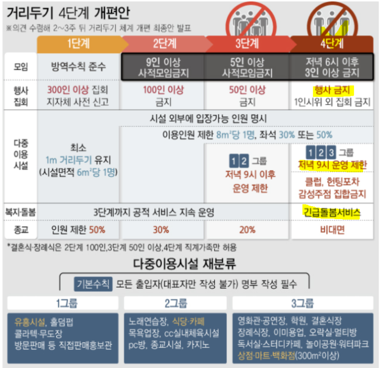 3그룹 학원, 독서실, 영화관, pc방 역시 22시 이후 운영제한이 되고요 결혼식장과 장례식장은 친족만 허용 가능하게 변경됩니다. 상점 / 마트 / 백화점 역시 22시 이후 운영제한이 되니 꼭 참고하시길 바랍니다. 학교 또한 원격수업으로 전환하게되니 초/중/고 학생분들의 학업 부분에 차질이 빚어지지 않게 확인해야 될 듯 보입니다.