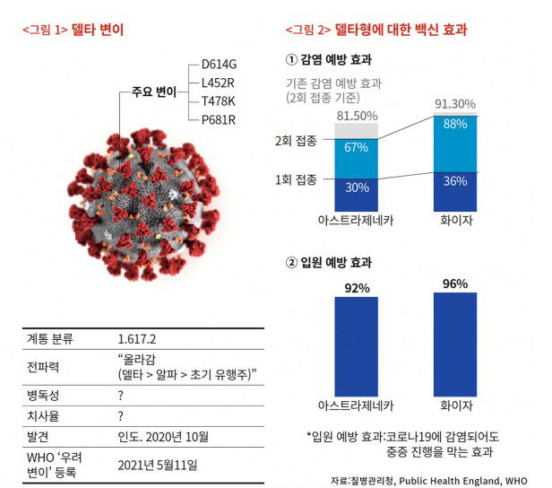 6월 영국 보건국 발표에 따르면 아스트라제네카와 화이자 모두 1회 접종만 마쳤을 때는 각 30%, 36%로 뎰타형 변이 바이러스 감염을 예방하는 델타 변이 바이러스 백신 효과가 상당히 떨어졌지만, 2회 접종 시에 변이 바이러스 예방효과는 아스트라제네카 67% 화이자 88% 로 나타나고있는데 제법 높은 방어 효과를 나타내고 있습니다.