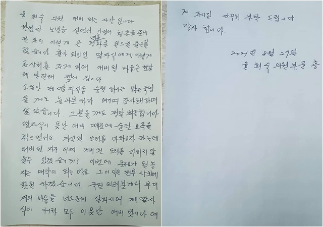 윤희숙 의원 부친의 자필 편지 용서 호소..