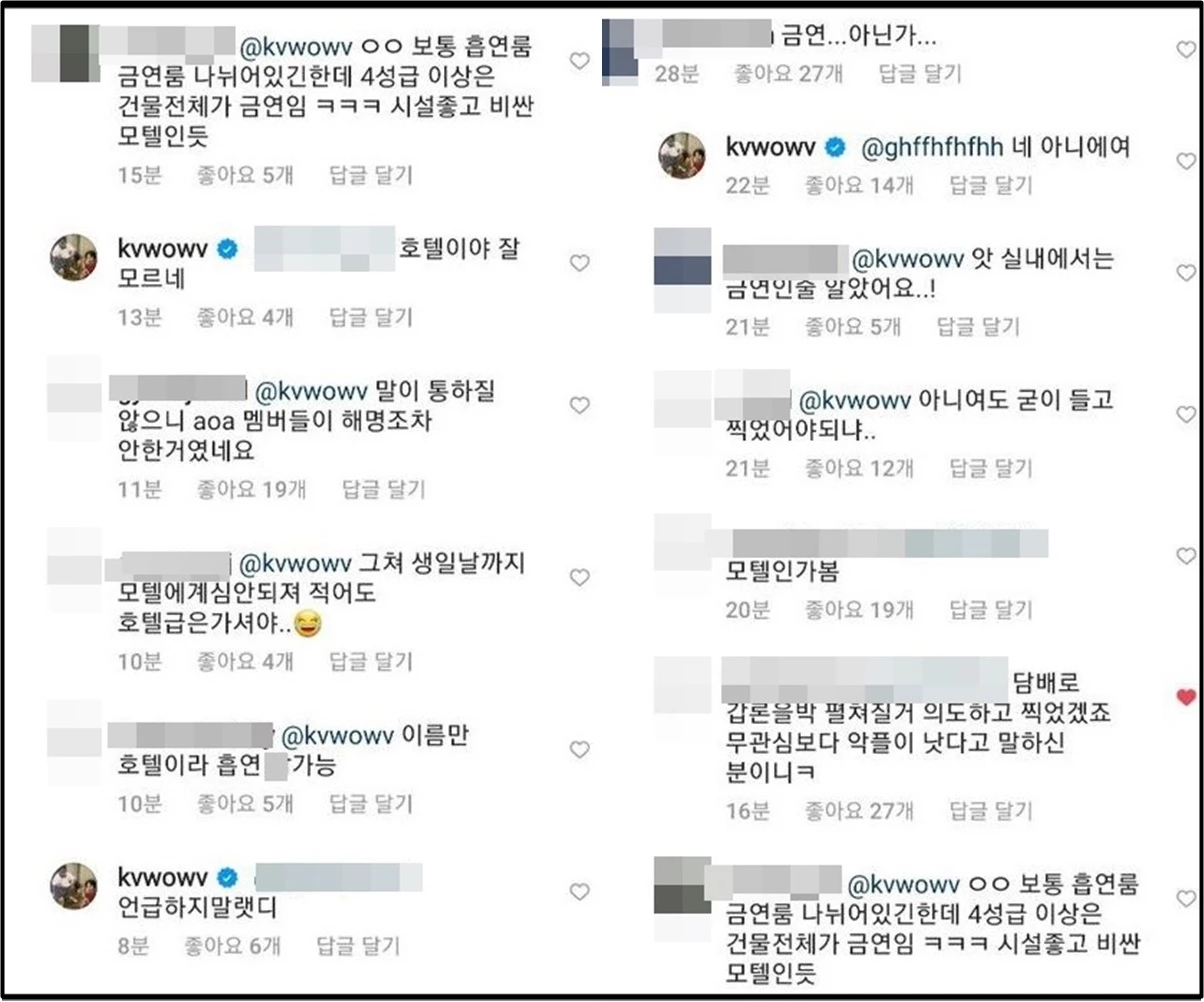 사진을 본 한 네티즌은 “금연 아닌가”라는 댓글을 남겼다. 이에 권민아는 “아니에요” “흡연방 잡았다”고 답했습니다. 그러나 다른 네티즌들은 권민아가 묵고 있는 호텔이 서울 용산구에 위치한 한 호텔로, 전 객실을 금연실로 운영 중이라고 설명했습니다. 이 같은 지적이 나오자 권민아는 해당 게시물을 삭제했습니다. 이후 권민아는 불이 붙은 담배를 들고 찍은 사진만 빼고 다시 사진을 올렸는데요. 대신 손에 담배를 든 모습은 여전히 남아 있었습니다.