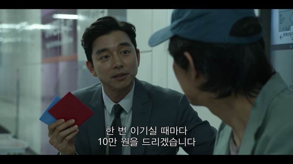 경마장에 성기훈을 잡으러 나타난 사채업자들의 협박에 못이겨 성기훈은 울며겨자먹기로 신체포기각서를 쓰게되고 지하철 플랫폼에서 우연히 만난 '양복남(공유 / 특별출연)'과 딱지치기를 하며 뺨까지 맞으면서 명함을 건네받게 됩니다. 그곳엔 오징어 게임 철자이자 약자인 동그라미, 세모, 네모가 그려져 있었습니다. ('○△□').