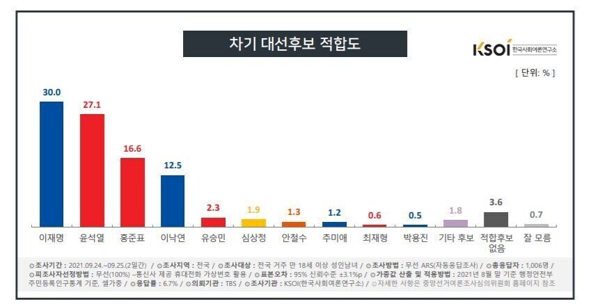 한국사회여론연구소(KSOI)는 ‘차기 대선 후보 적합도’ 여론조사 결과, 이재명 지사 30%, 윤석열 전 검찰총장이 27.1%, 홍준표 의원이 16.6%, 이낙연 전 더불어민주당 대표가 12.5%를 기록했다고 27일 밝혔습니다. <티비에스>(TBS) 의뢰로 지난 24일∼25일 전국 만 18살 이상 성인남녀 1006명을 대상으로 물은 결과(신뢰수준 95%, 표본오차 ±3.1%포인트)입니다.